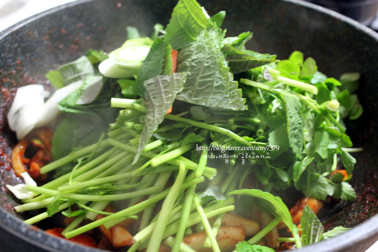 먹기직전에 미나리 + 깻잎 + 대파를 넣고 조금더 볶으면 완성입니다