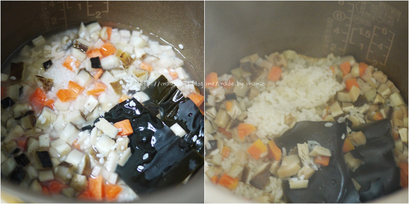 밥 지을 때 미리 우엉대, 연근, 표고버섯, 당근 등을 넣고 다시마와 맛술로 밥 맛을 업그레이드 했습니다.