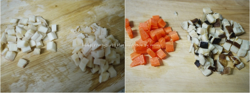 (우엉과 연근은 채칼로 껍질을 벗겨서 다집니다. 표고버섯 밑기둥은 잘게 다져주세요)