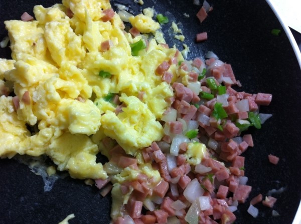 3. 재료들이 충분히 익었다 싶으면 후라이팬 한쪽으로 재료를 밀어넣고