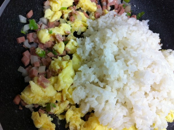 주재료: 스팸, 양파, 파, 계란, 밥, 김치