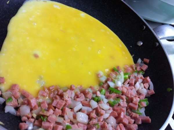 1. 스팸, 양파, 파를 잘게 썰어서 후라이팬에 식용유를 두르고 볶아줍니다.