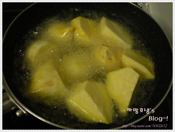 후라이팬에 기름을 부어서 기름 온도가 올라갔을때 고구마를 넣어줍니다.