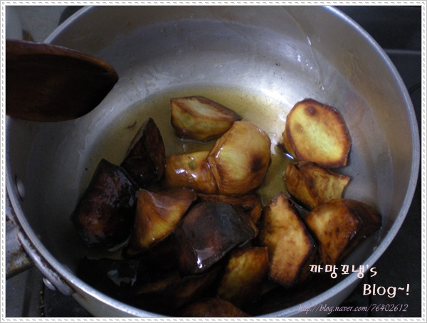 시럽이 완성되면 튀겨놓은 고구마를 퐁당 넣어서 버무려줍니다.