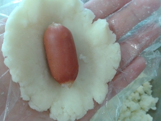 3.위생 장갑을 끼고 으깬 감자를 납작하게 만들어 비엔나 소시지 올리고 동글동글하게 감싼다