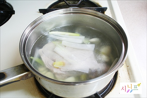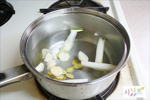 냄비에 물 4컵 + 마늘 4톨 + 생강 1/2톨 + 대파 흰부분 1대 넣어 물이 끓으면