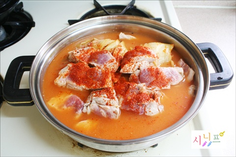 냄비에 묵은지 1/2포기 깔고 그 위에 데쳐 낸 고기를 두툼하게 썰어 올려줍니다.