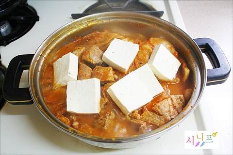 국물이 어느정도 줄어들면 두부 1/2모를 올리고 국물을 끼얹은 후 뚜껑을 닫아