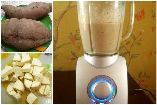 고구마 500g과 물2컵을 넣은후 곱게 갈아줍니다.
