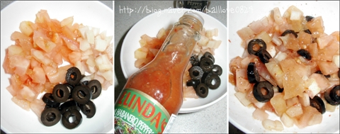 토마토도 껍질을 벗기고 잘게 썰고 블랙올리브도 함께 썰어서 볼에 같이 담았어요~