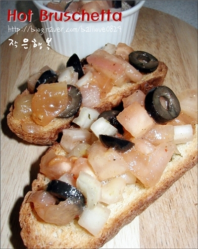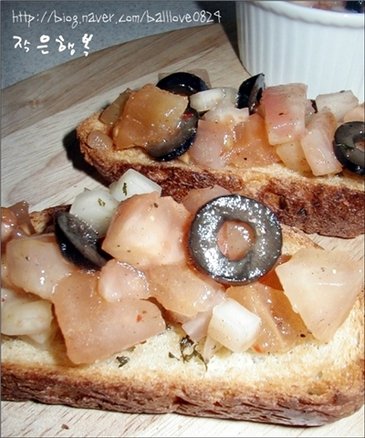 김치랑 핫소스를 넣어서 매콤하믄서 상큼한 부르스케타를 맹글었어요^^