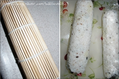 5. 랩과 함께 김발을 이용해서 꾹꾹 눌러가며 모양을 잡아주세요~