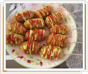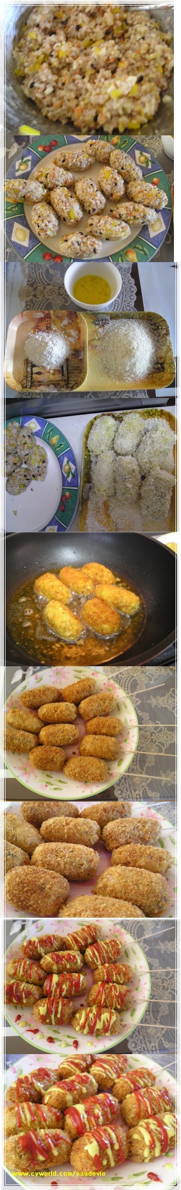 밥, 소시지, 파프리카, 양파, 볶음용 잔 새우, 깨, 계란, 밀가루, 부침가루, 빵가루