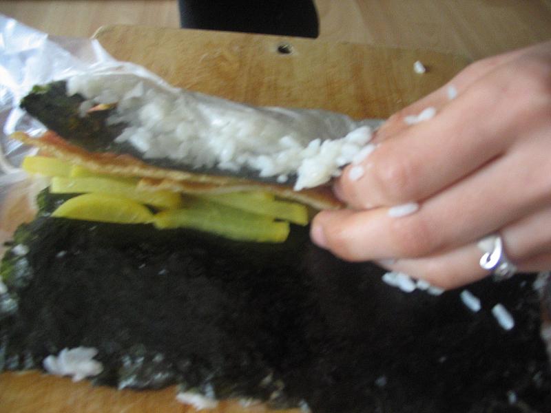 김위에.밥을.고루다펴서.바른후에...비닐랩으로 꾹꾹눌러준후 같이뒤짚어줘요..