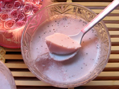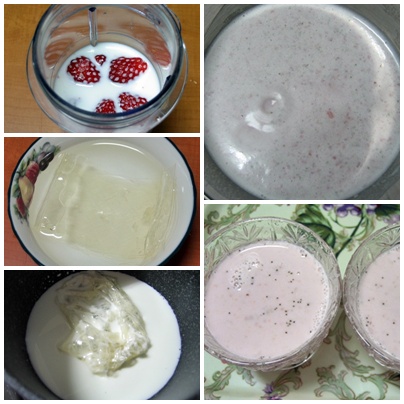 2. 미리 불려둔 젤라틴을 설탕, 딸기와 우유 갈아 놓은 것에 넣고