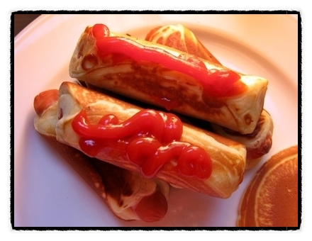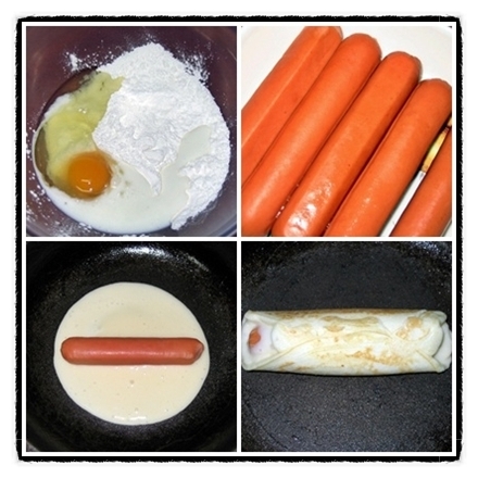 3. 반죽을 붓고 위에 소세지 올려 돌돌 말아주면 간단핫도그 완성!!