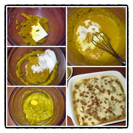 익혀서 으깬 단호박에 부드러운 버터, 설탕, 계란, 우유를 넣고
