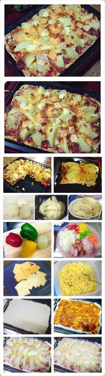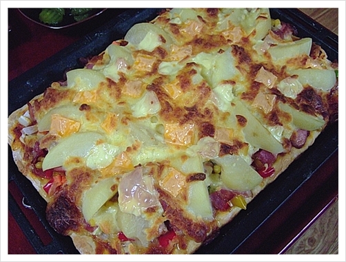 감자, 토핑(감자, 청.홍.노랑 파프리카, 양파, 당근, 베이컨, 후랑크소세지, 치즈, 옥수수캔, 피자치즈)