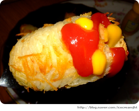 감자, 식빵, 후랑크소세지, 케첩, 머스터드 소스, 달걀, 식용유