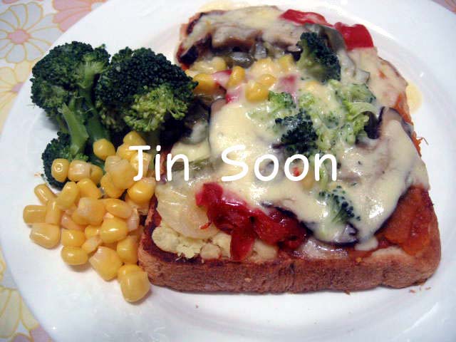 8 그 위에 준비해둔 각종 토핑재료 , 브로콜리,양파,청홍피망,표고버섯,
