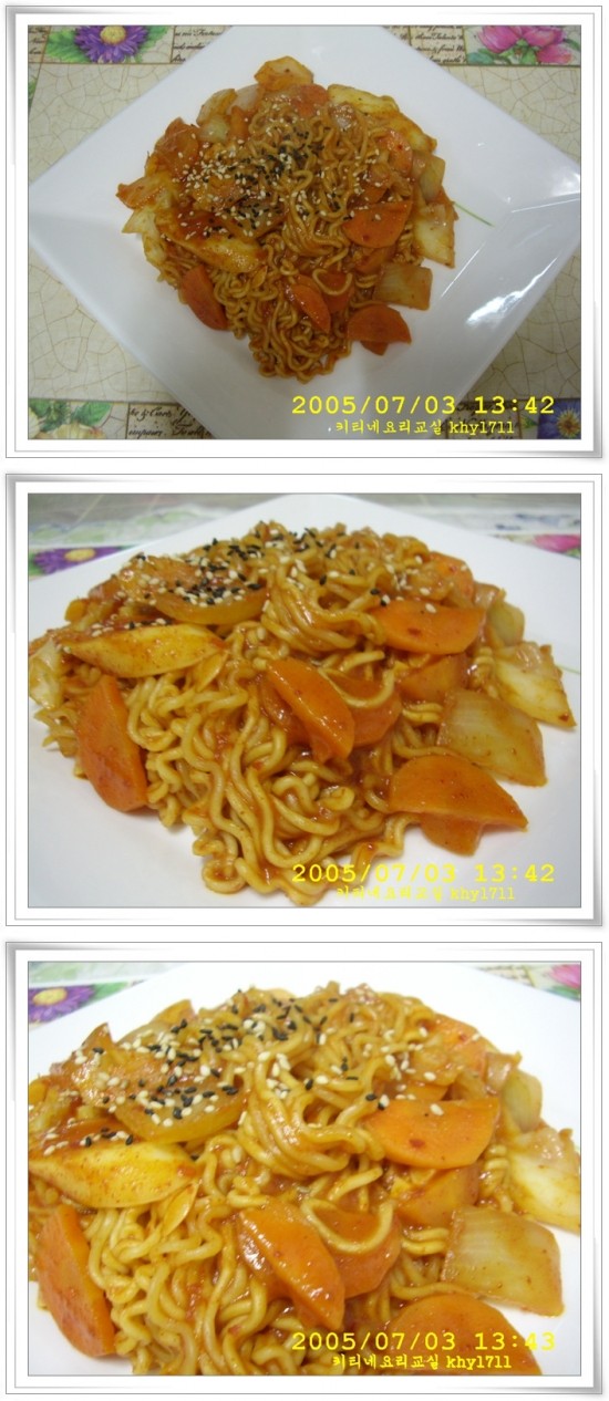 라면, 양념소스(고추장, 물엿, 고추가루, 마늘, 깨), 당근, 양배추, 양파, 포도씨오일
