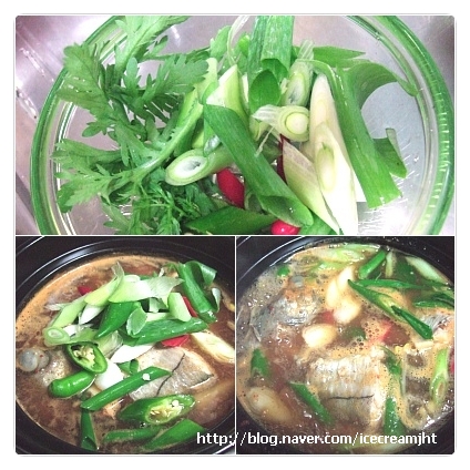 대파와 고추는 어슷썰어 넣어주고 쑥갓을 잠시 둔다