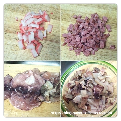 맛살과 햄은 뜨거운 물에 살짝 데친후 다져준다
