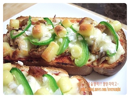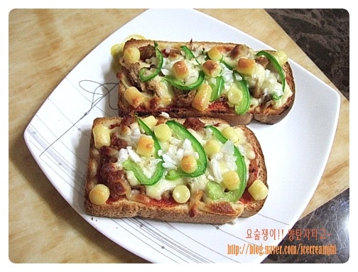 식빵에 치킨양념소스를 바르고 피자치즈를 올려준다