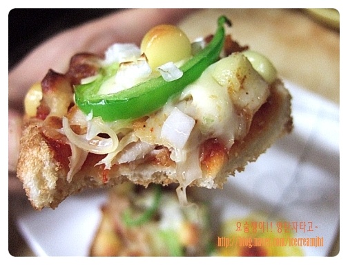 다시 피자치즈를 듬뿍 올리고 피망과 양파를 올려준다