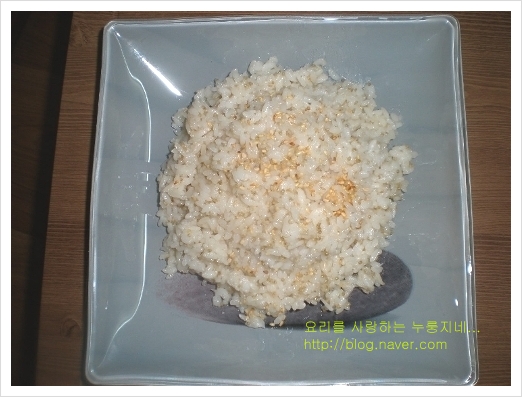 따뜻한 밥에 단촛물과 참기름을 넣어 맛나게 섞어 줍니다.
