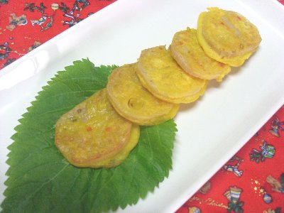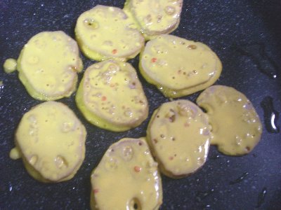 기름을 두른팬에 연근을 넣고 부쳐 줍니다