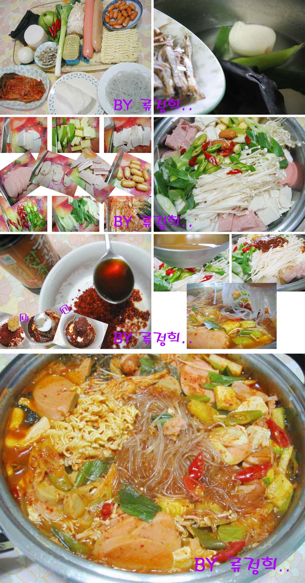 소시지(야채소시지, 스팸, 비엔나 소시지) 4가지 라면 1/2개 ,당면 200g ,김치 1/4쪽 ,두부1/4모 무우 1/6개 ,호박1.4개 ,청홍고추 3개 ,대파1대 , <국물재료> 무우 1/4개, 멸치 작은 한주먹 <소스재료> 고추가루 3큰술, 다진마늘 1작은술, 간장 1큰술, 소금,후추약간