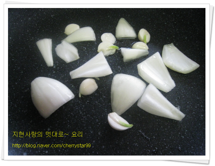 양파는 먹기 좋은 크기로 썰어주고 마늘은 편으로 썰어 줍니다.