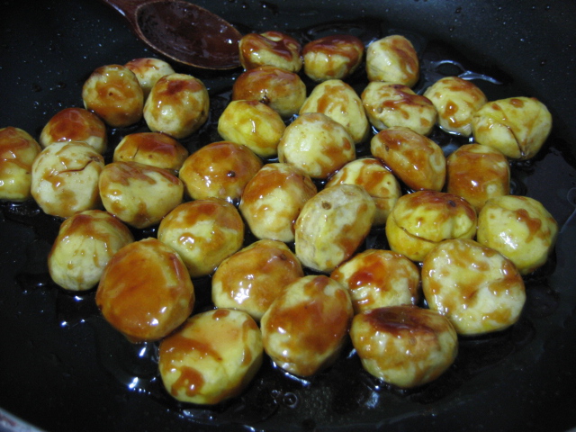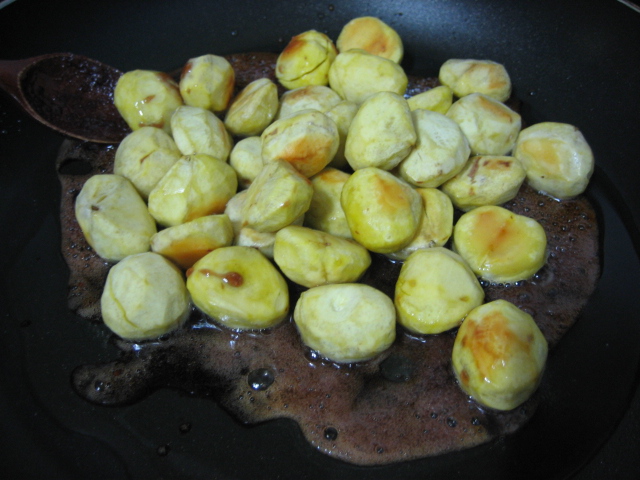 4. 시럽에 구워진 밤을 넣고 시럽이 식기전에 골고루 버무려 준다.